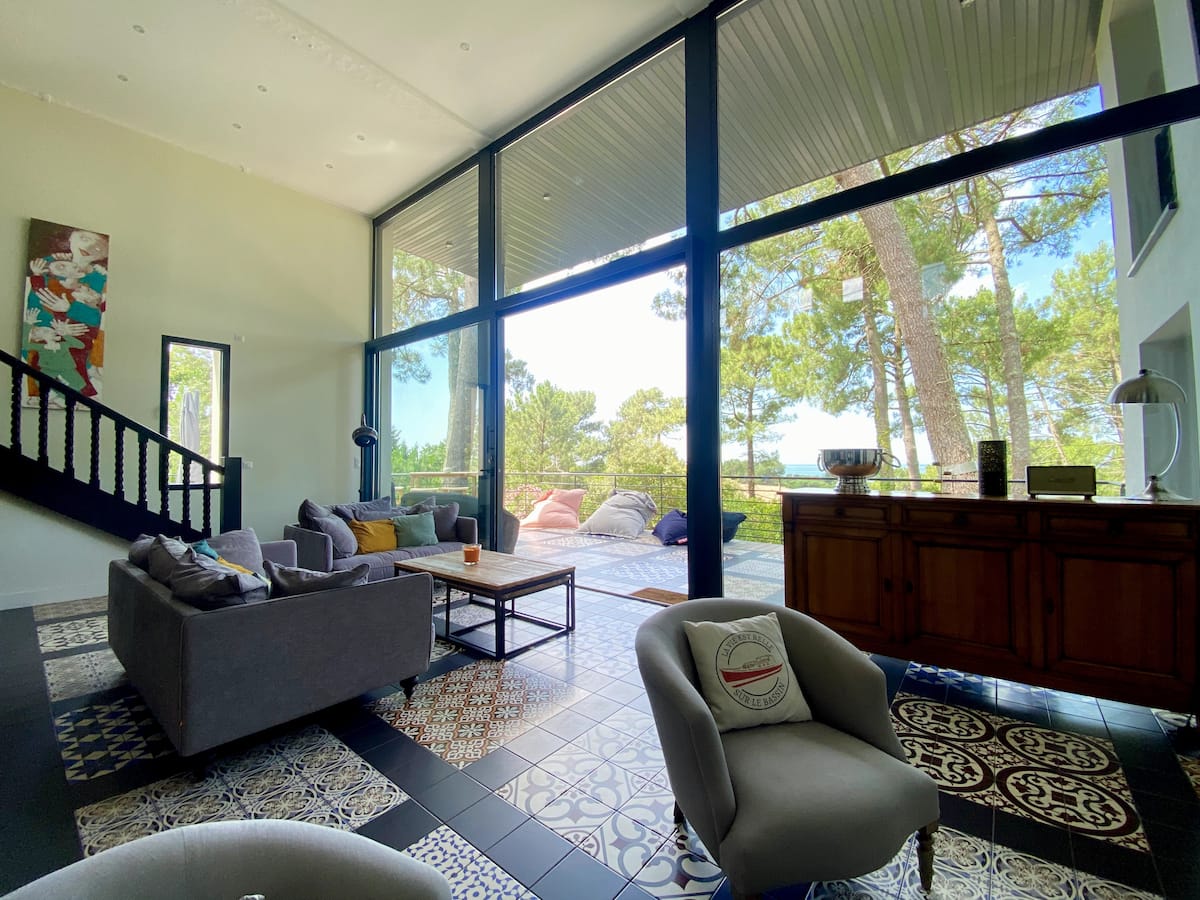 Bénéficiez d'une pièce à vivre baignée de lumière avec une magnifique vue dégagée sur la mer à la cime des pins.