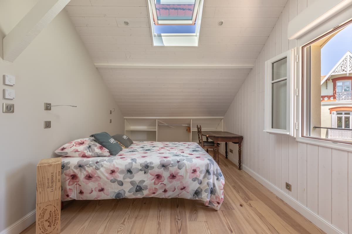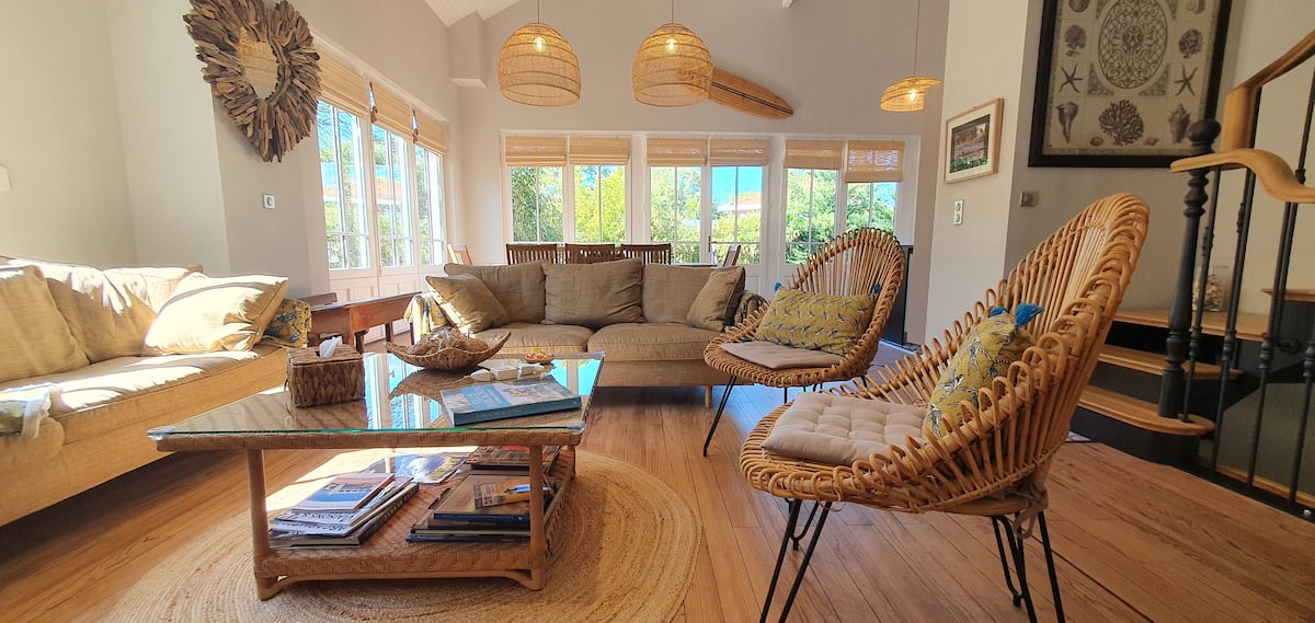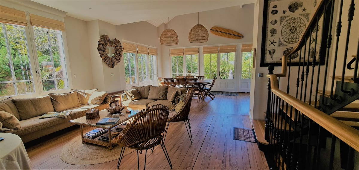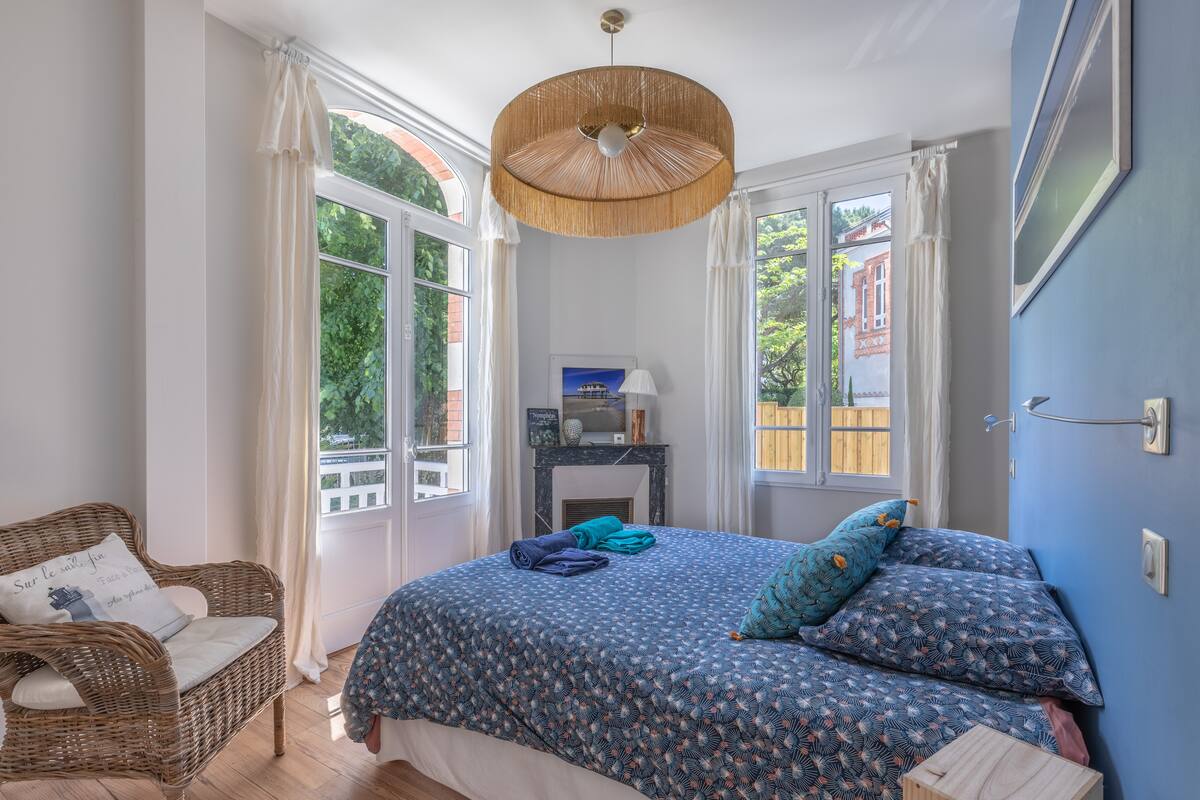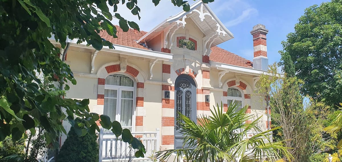 Villa Arcachonnaise, emplacement Premium, prestations haut de gamme, climatisation, fibre. En Ville d'Hiver, 50m du Parc Mauresque, 250m cœur de ville et marché, 300m plage, 700 m gare. 6 chambres (2 au rdc, 3 au 1er, 1 au rdj), 5 Sdb, 5 wc, cuisine équipée, sam, salon, arrière cuisine. Jardin paysager 615 m2. Terrasse bois 200 m2, salon jardin, bains soleil, plancha. Boulodrome, table ping pong. Idéal en famille et entre amis.