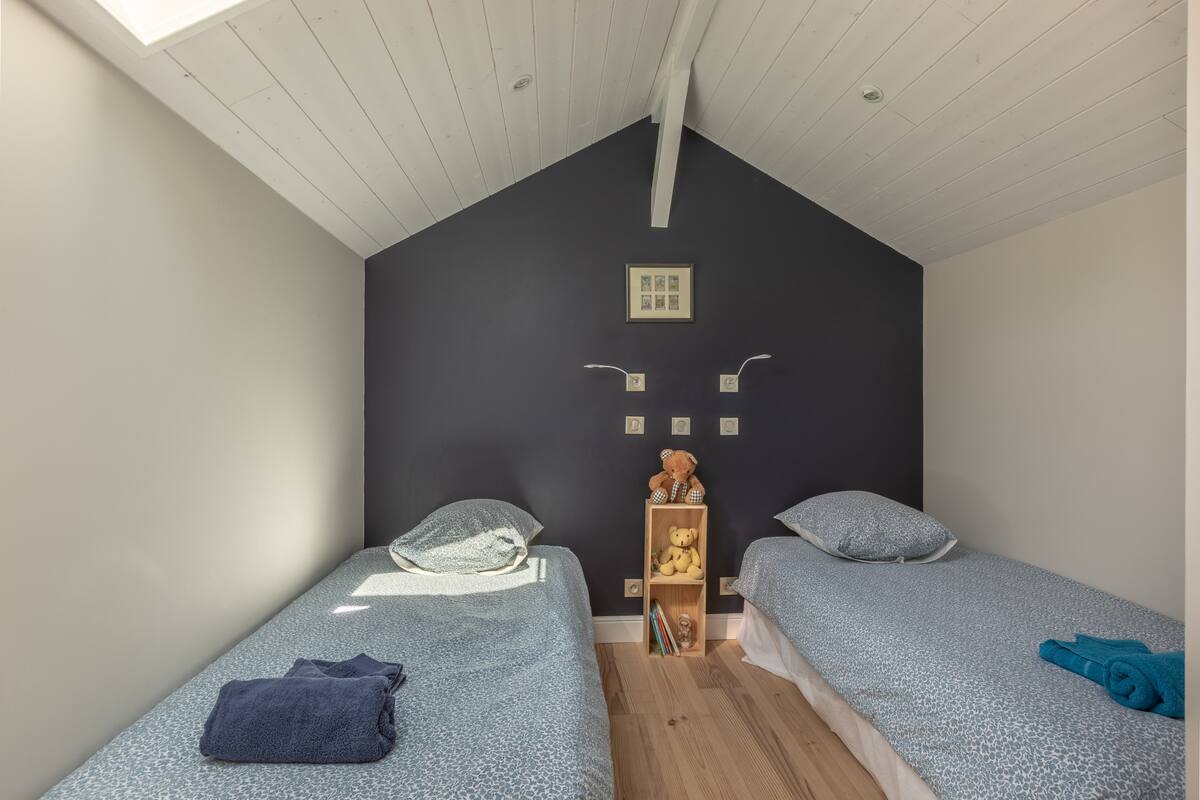 Au 1er étage, 3 chambres : 1 Suite avec sa salle de bain, dressing et rangements. La Family Room (4 lits de 90) et une 3ème chambre (2 lits de 90 pouvant être assemblés) se partagent une salle d'eau commune avec wc.