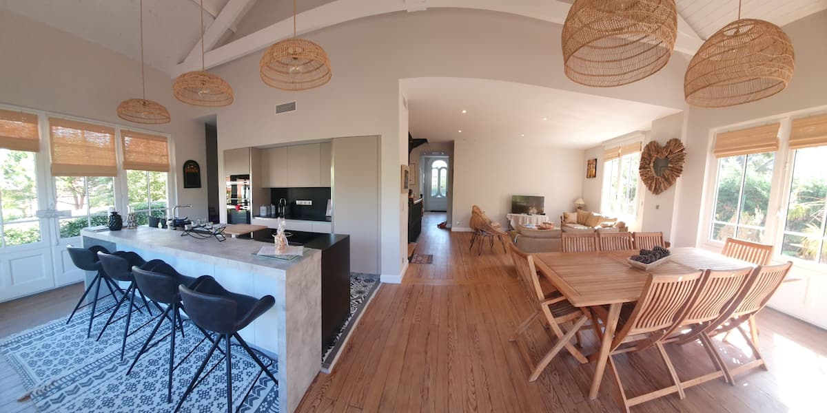 Au rdc : entrée avec rangements, vaste espace de vie composé d'un séjour, salle à manger, cuisine ouverte équipée avec îlot central et comptoir bar très convivial. Une arrière cuisine avec évier, rangement et second frigo/congélateur permet de déposer et stocker aisément les courses. Le tout est traversant, baigné de lumière par de larges baies vitrées et ouvre en façade Ouest sur la terrasse en bois.