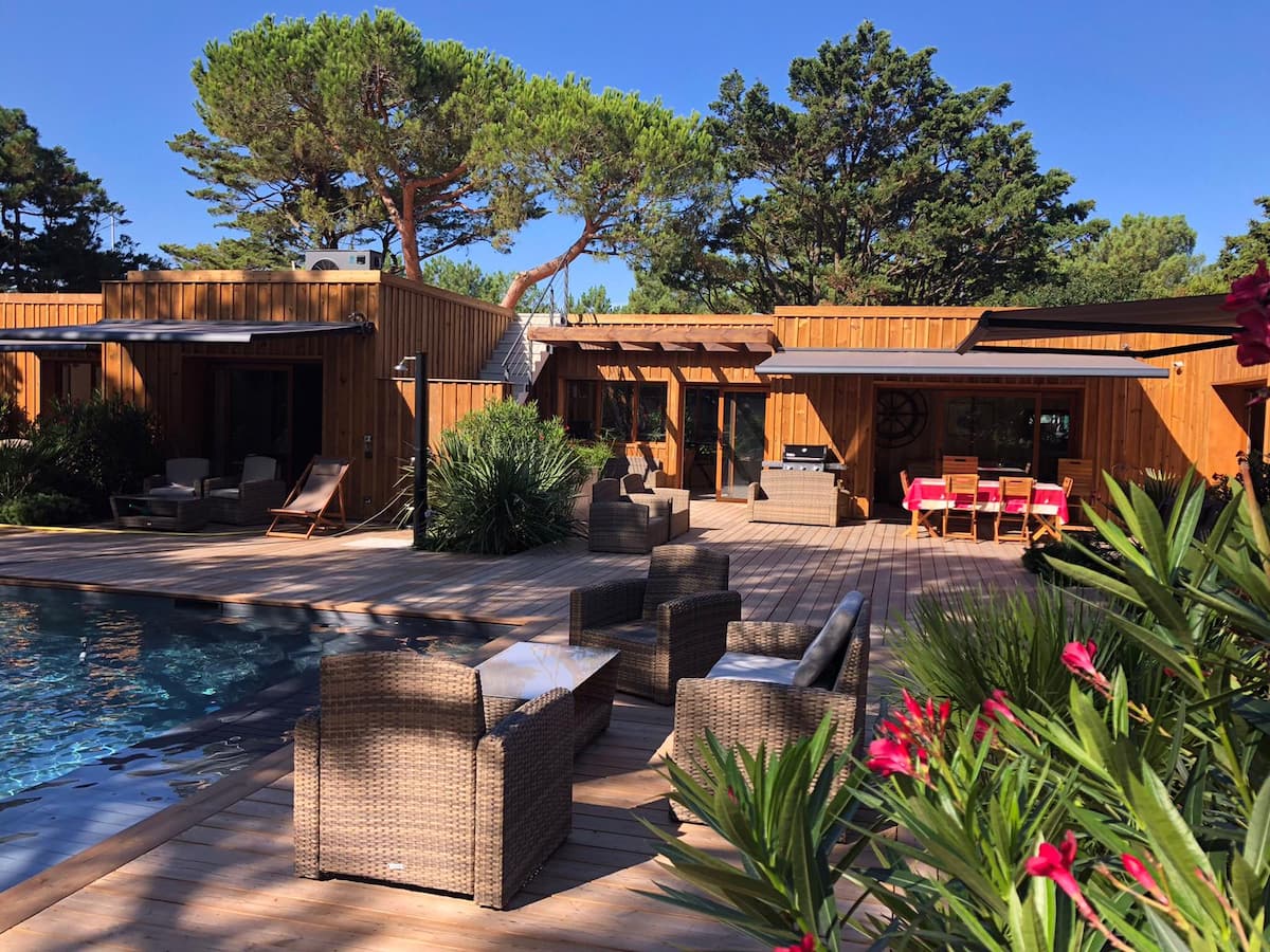Très belle villa à la Pointe du Cap Ferret, avec ses 6 suites très confortables, son immense piscine chauffée (du 1er mai au 30 septembre*). La villa est entièrement équipée d'un système de climatisation individuelle pour chaque pièce.