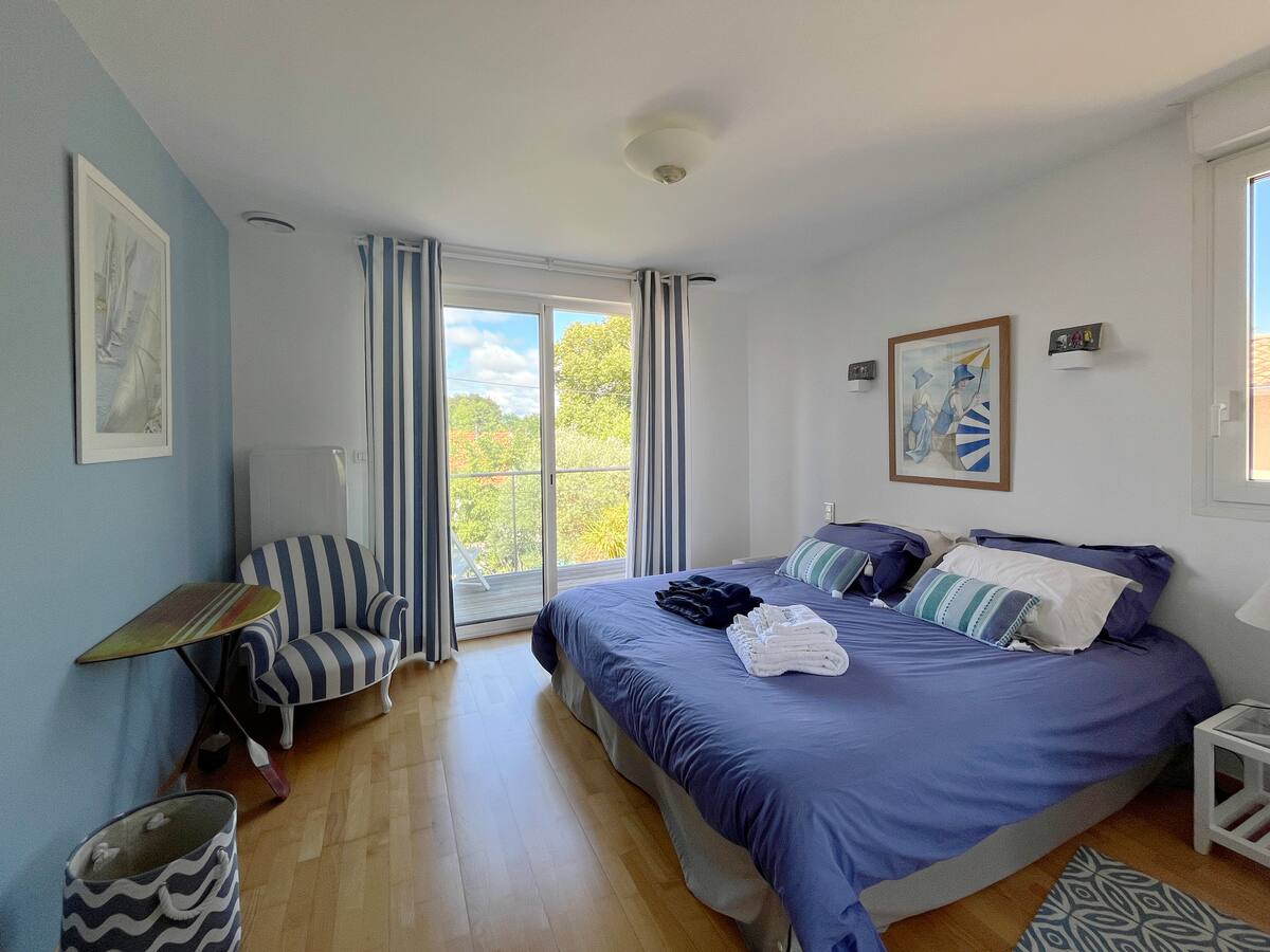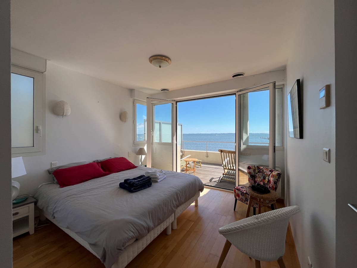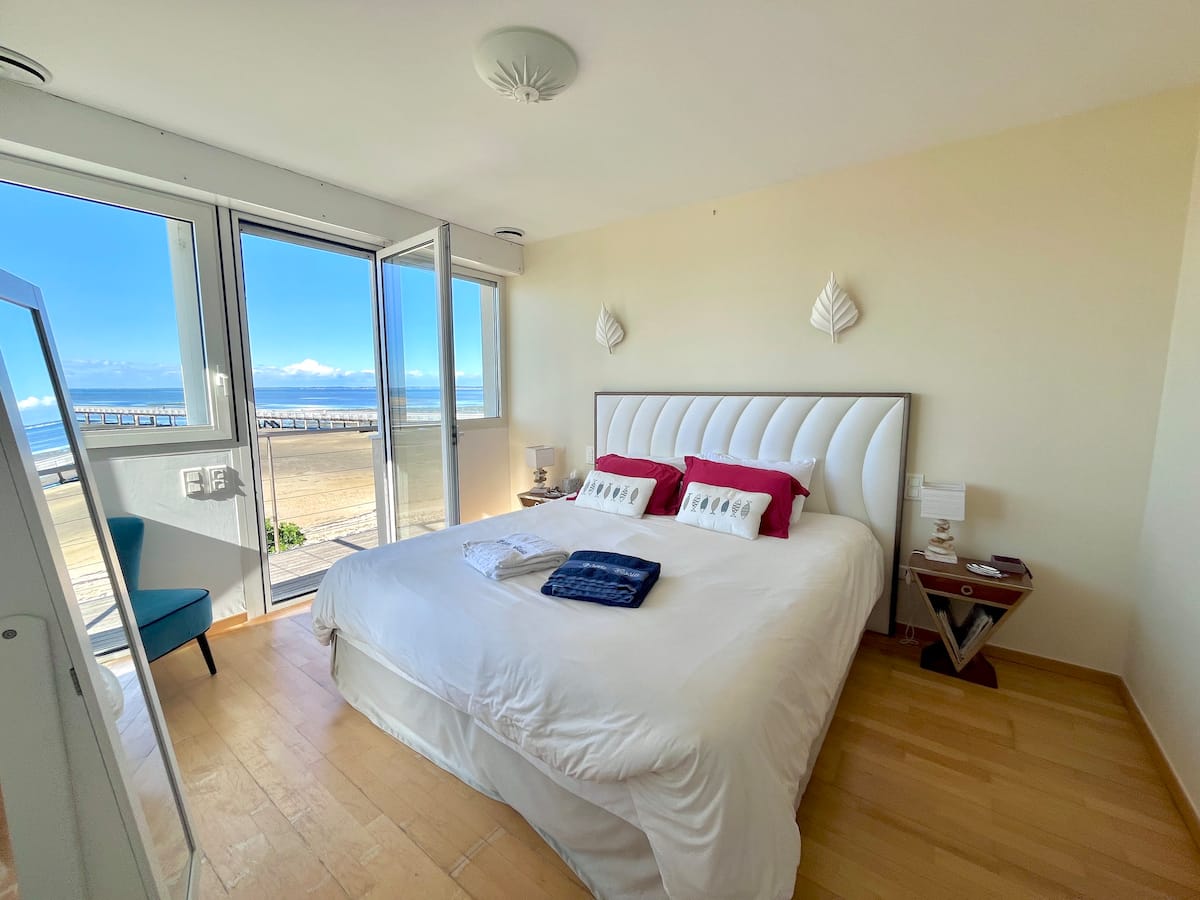 lit double de 180, placard, accès à un balcon avec vue imprenable sur la plage et transats