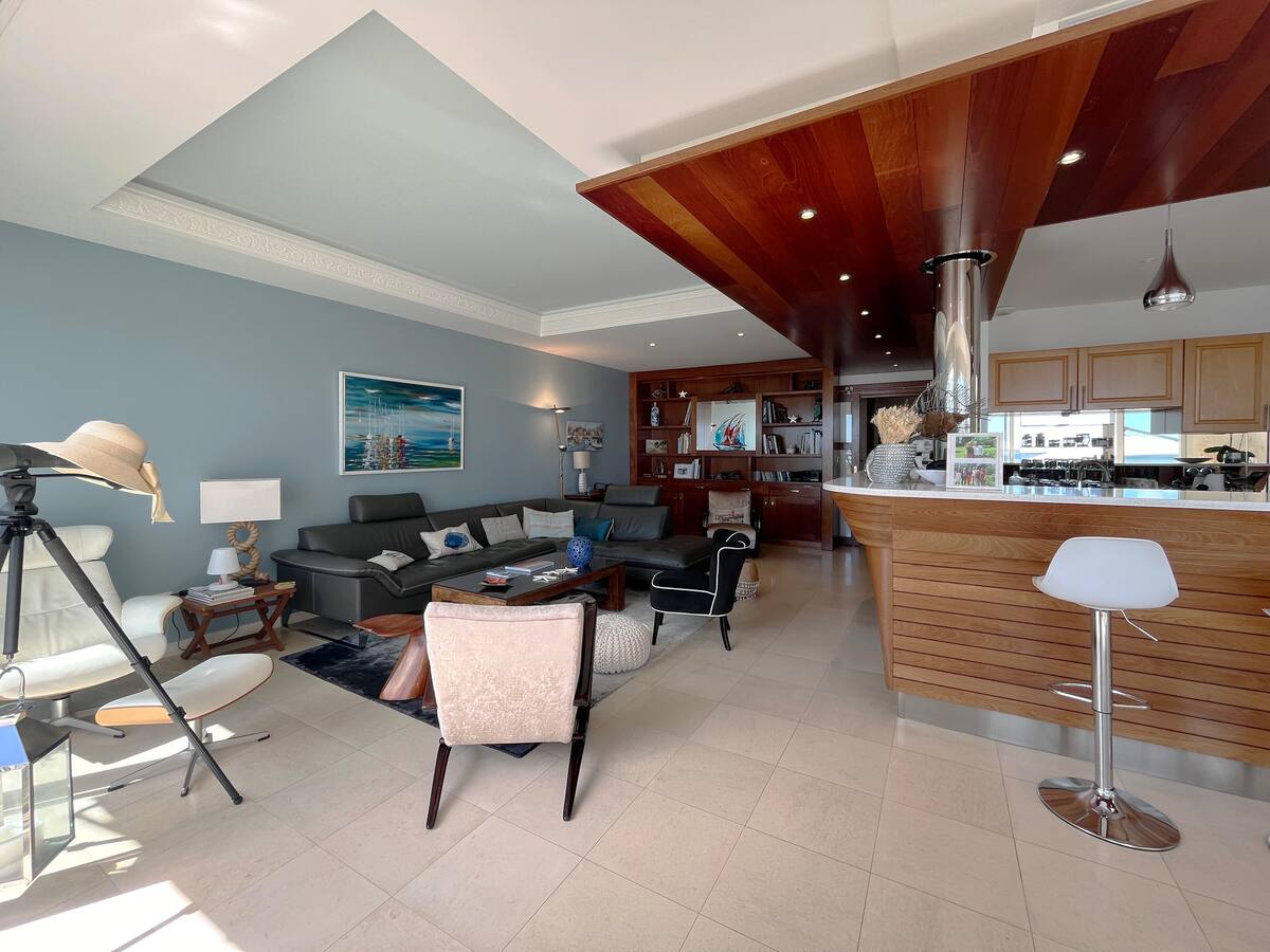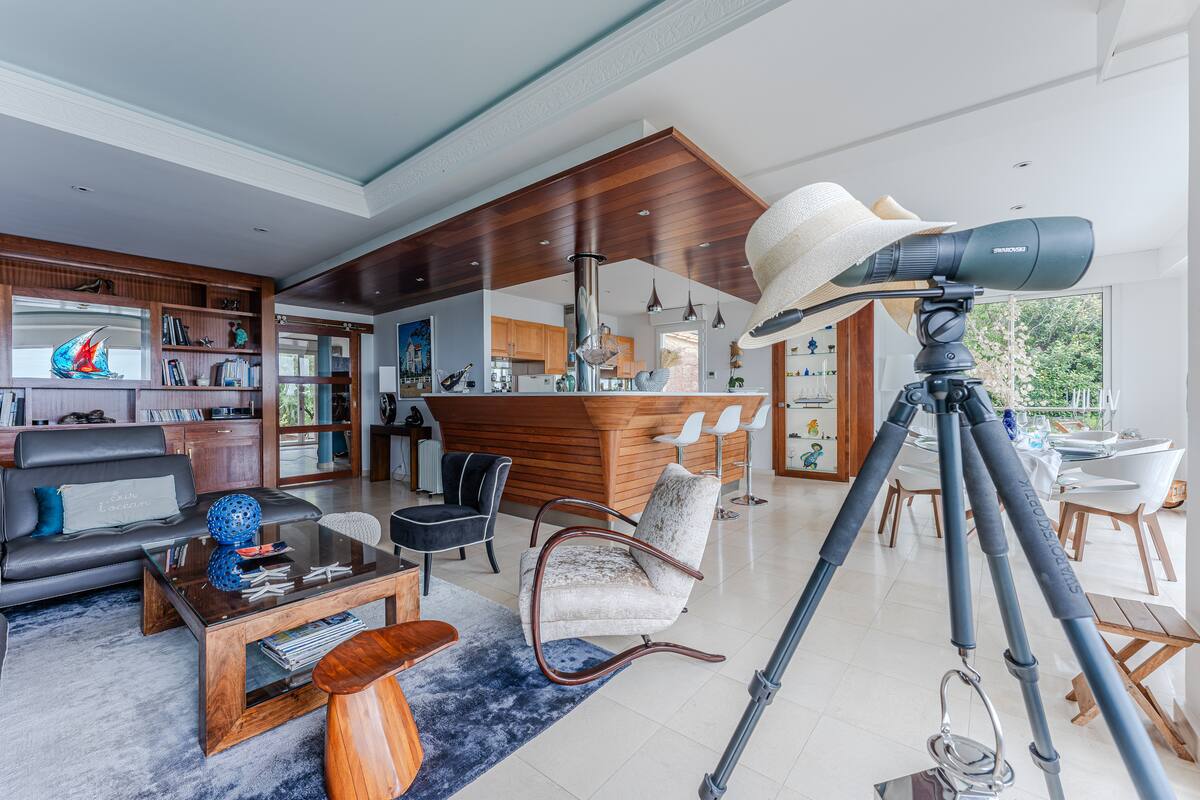 • Cuisine / Bar entièrement équipée (four, plaque de cuisson, micro-ondes, cafetière, bouilloire, lave-vaisselle, lave-verre) avec vue sur la mer.