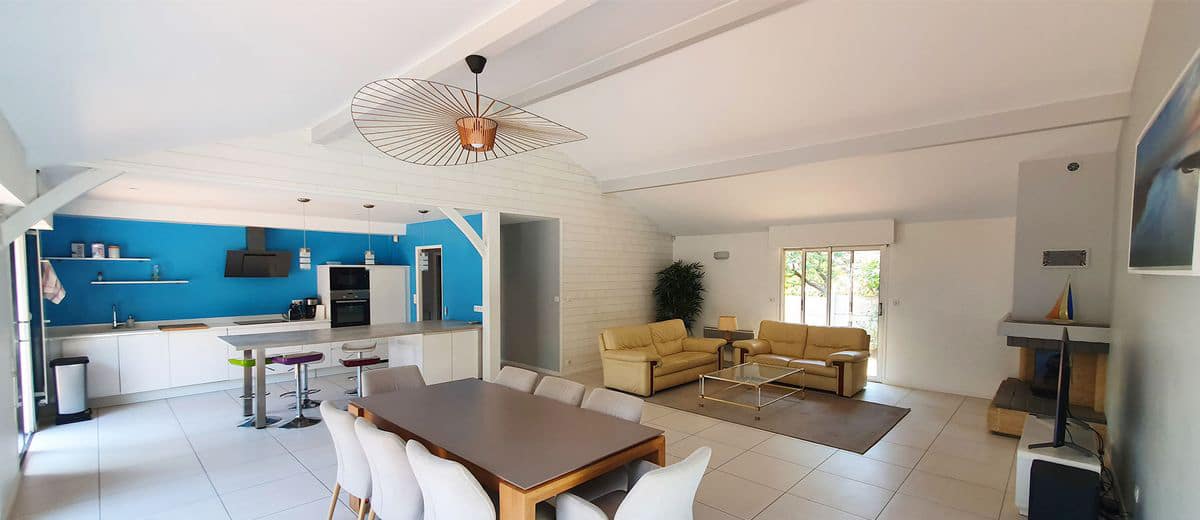 La cuisine entièrement équipée est ouverte sur le salle à manger et le salon, offrant un espace lumineux et convivial.
