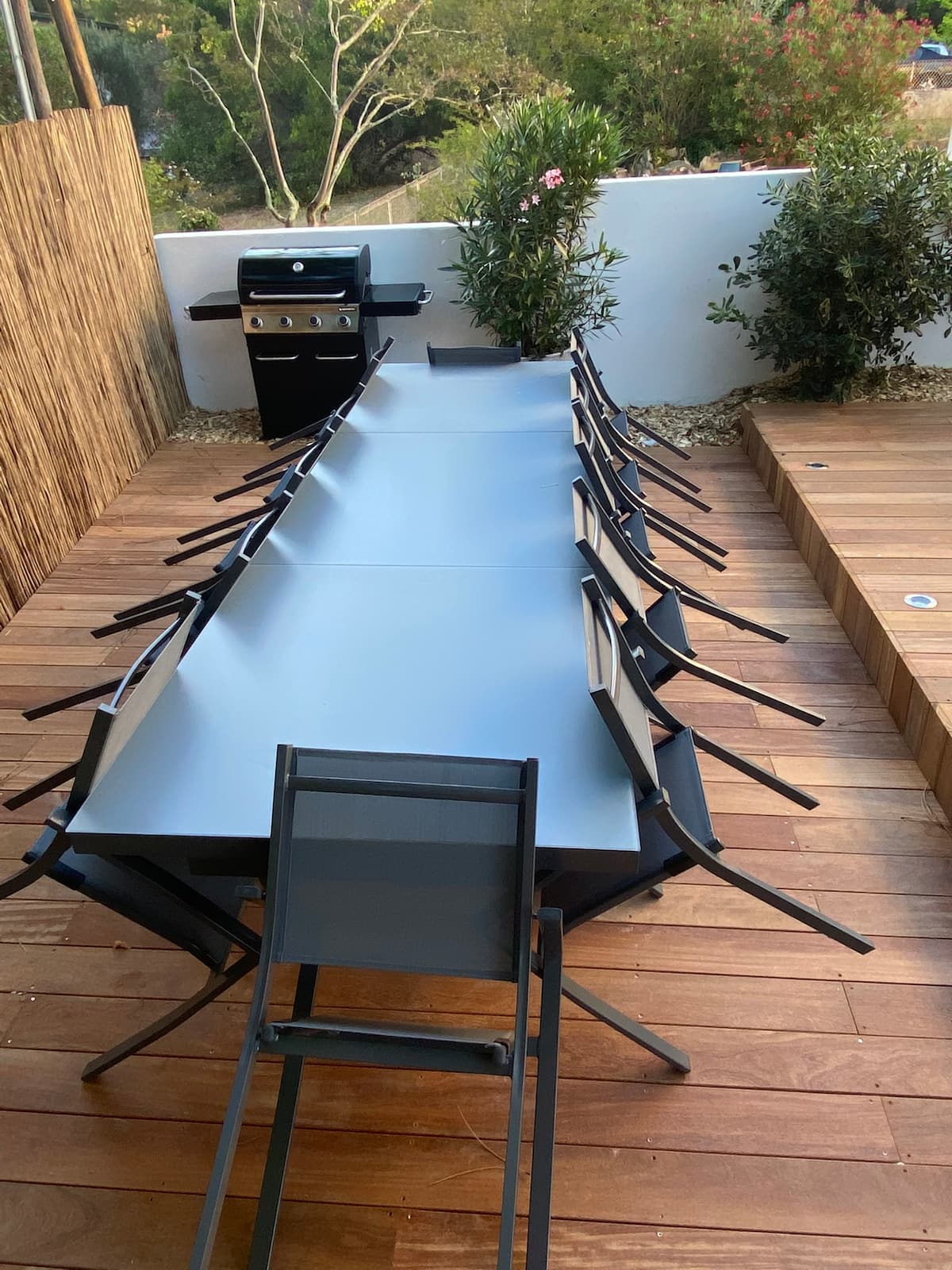Extérieur : grande terrasse, piscine, douche extérieure et barbecue.