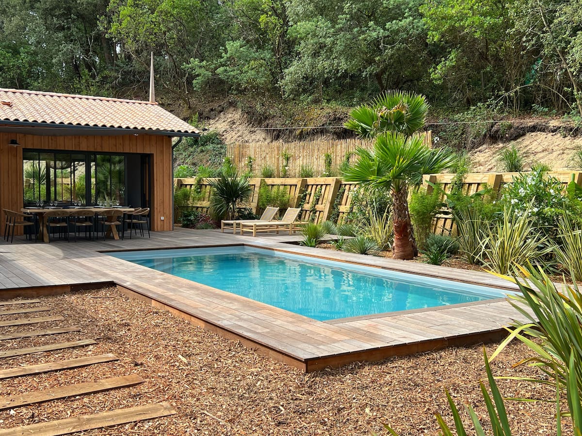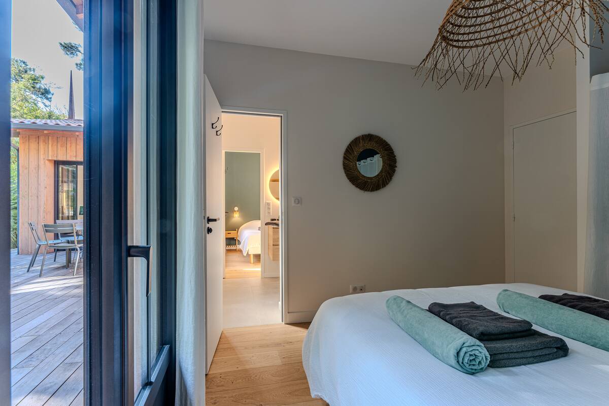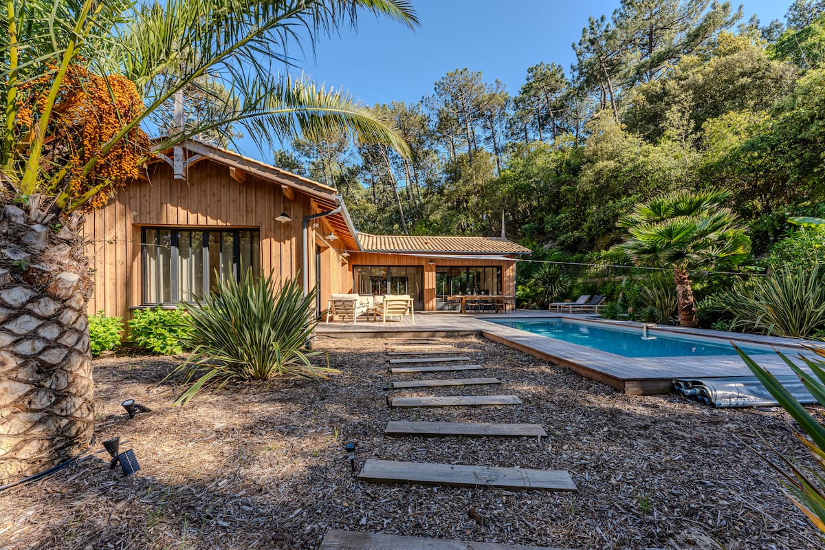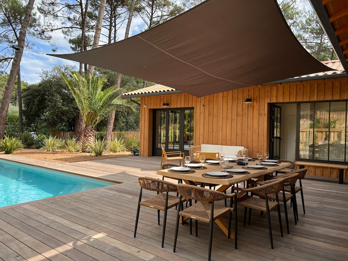 La conciergerie CALM vous accueille dans cette magnifique villa neuve, nichée au milieu des pins, offrant un cadre idyllique pour des vacances entre amis ou en famille sur la Presqu'île du Cap Ferret. Elle peut accueillir jusqu'à 12 voyageurs. La maison dispose d'une grande terrasse en bois, d'une piscine et du mobilier extérieur idéal pour profiter du climat estival.