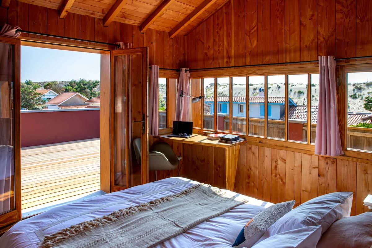 A L’étage un penthouse en bois de 40m² propose une suite dotée d’un espace nuit avec un lit double offrant une vue imprenable sur la dune, de deux bureaux de (télé)travail, une salle d’eau avec WC et un coin détente supplémentaire.
