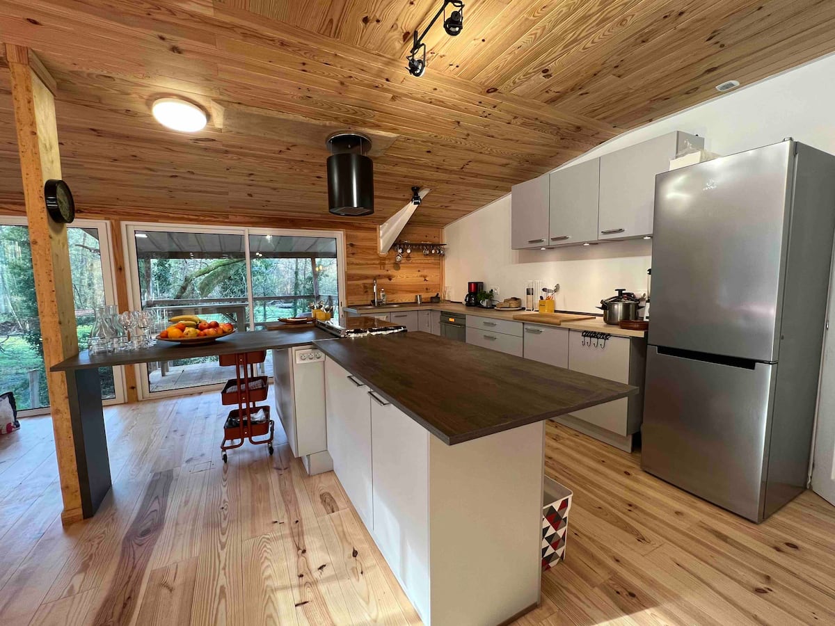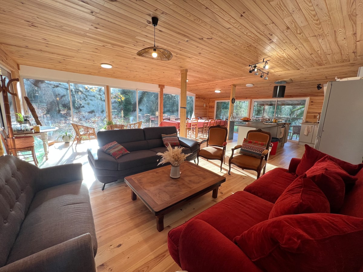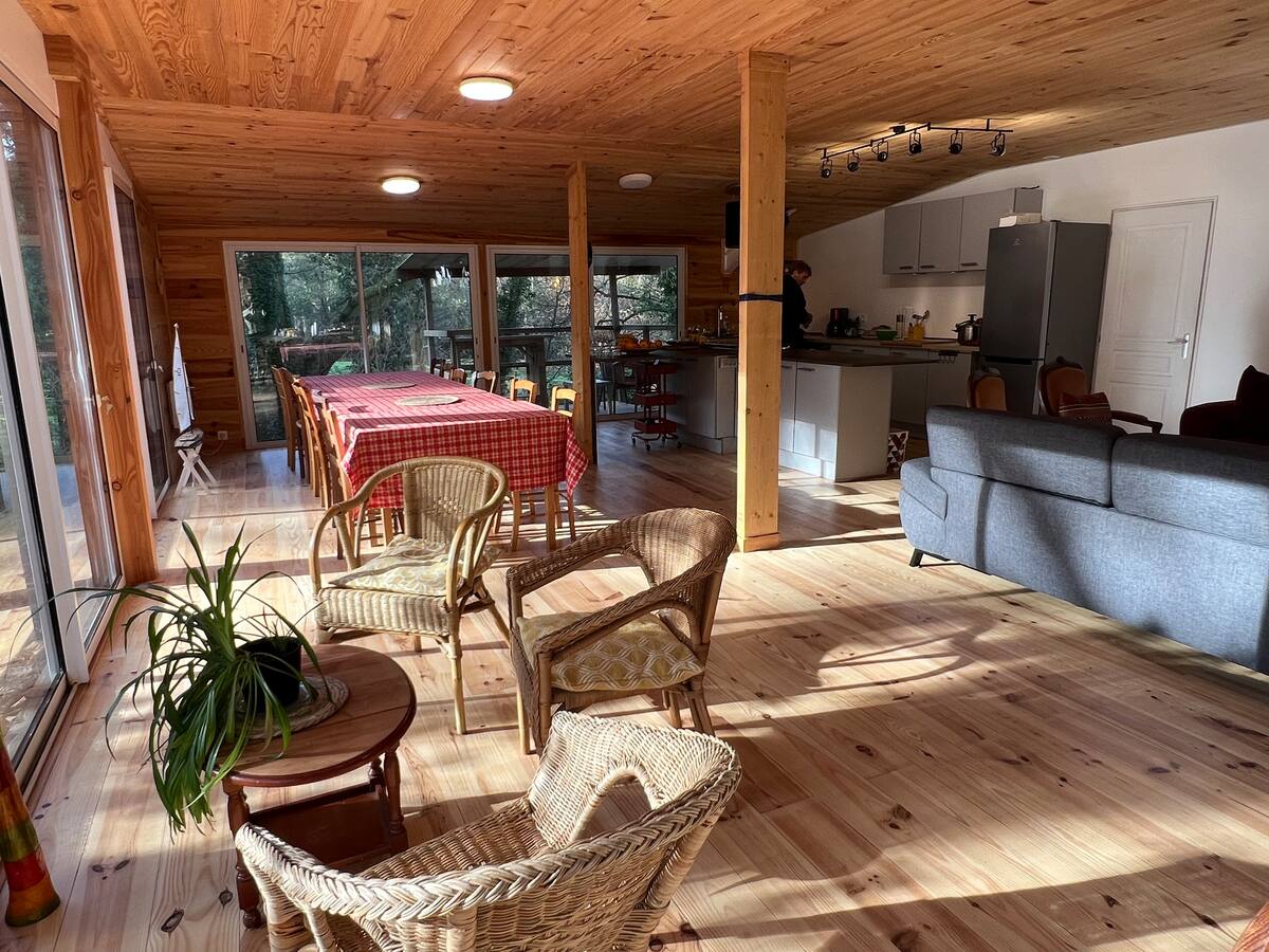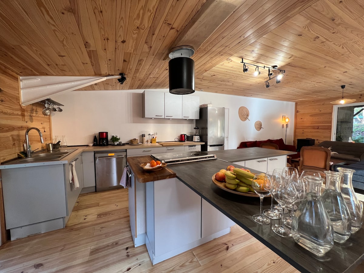 Le logement est composé d'une grande pièce de vie lumineuse entourée de baies vitrées, une partie salon et une grande cuisine américaine donnant sur une table pour 14 personnes afin d'offrir des moments de convivialité unique.