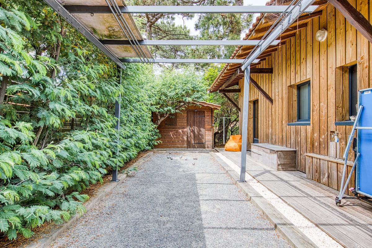 Une grande terrasse de 80m² dont la moitié est couverte par un auvent vous accueillera pour vos repas en famille et avec vos amis. La plancha (gaz fourni). et le barbecue (charbon) sont a côté