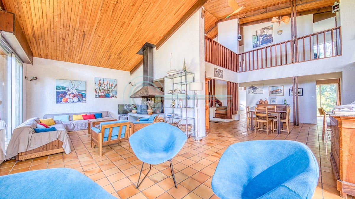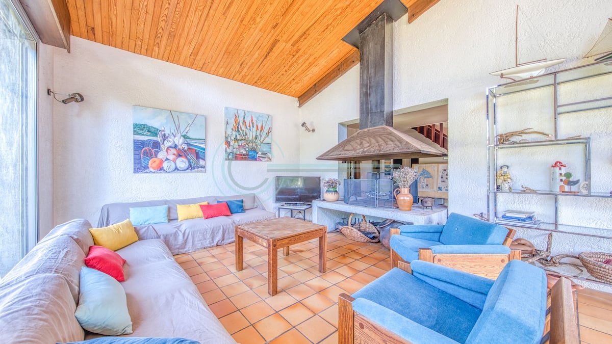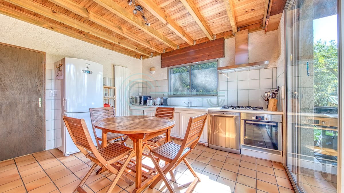 La villa se compose en rez-de-chaussée d'un vaste salon/salle à manger avec cheminée, une cuisine équipée séparée.
