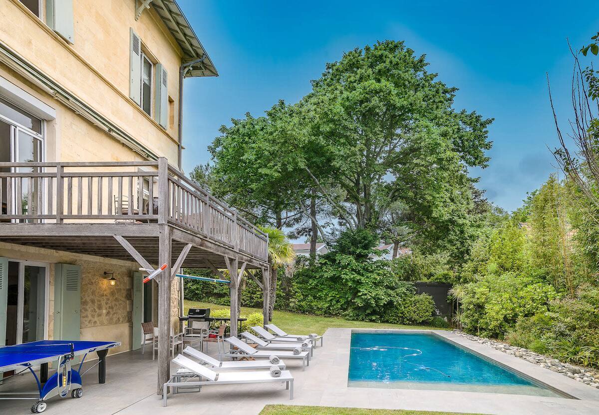 Son jardin, sa piscine chauffée 9.50x1.70m, ses deux terrasses et son environnement au voisinage calme, font de cette Villa un havre de paix tout en étant à proximité et accessible à pied ou en vélo, des plus belles plages d’Arcachon (dont la plage Pereire), des centre-villes d’Arcachon ou du Moulleau.