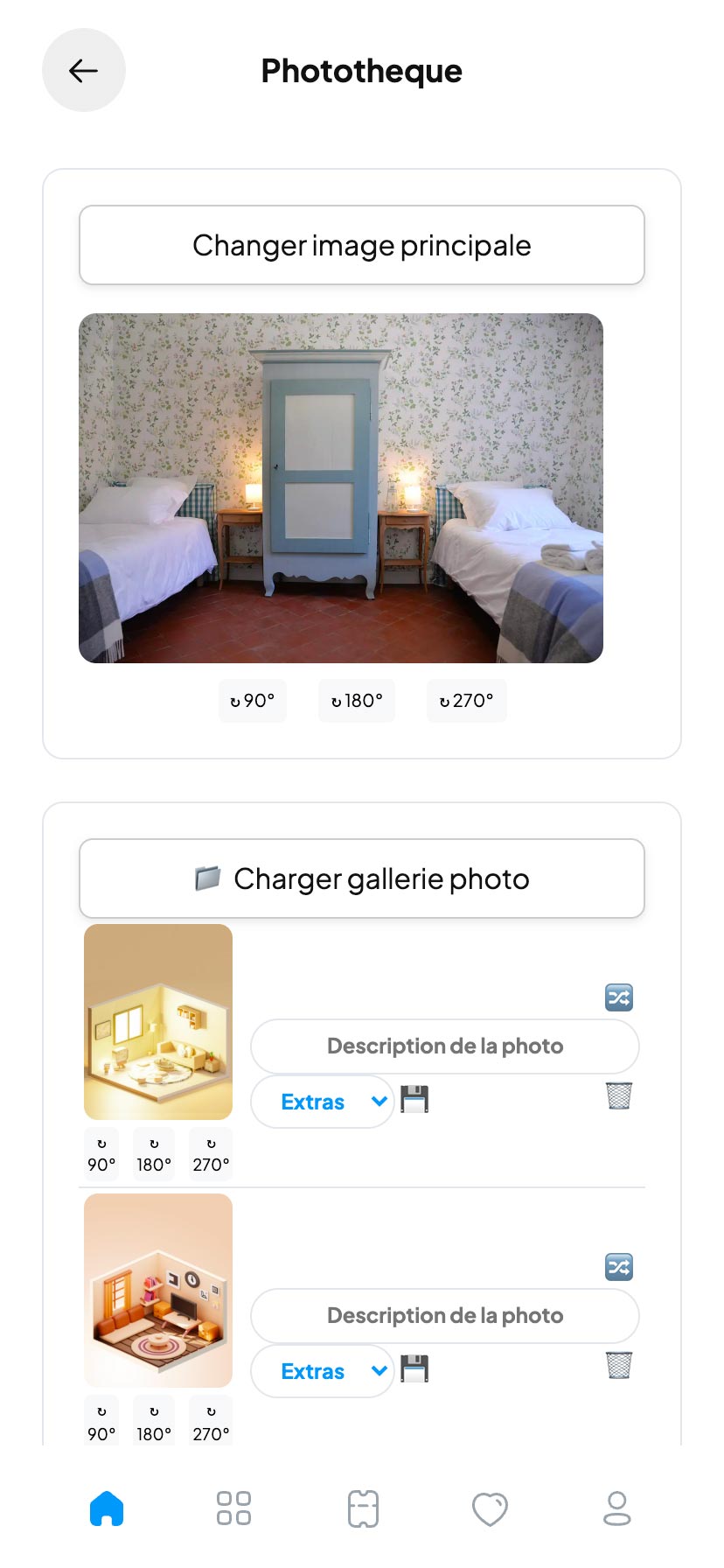 Chargez, classez et légendez vos photos facilement. Vos futurs locataires peuvent visiter votre logement visuellement, pièce par pièce.