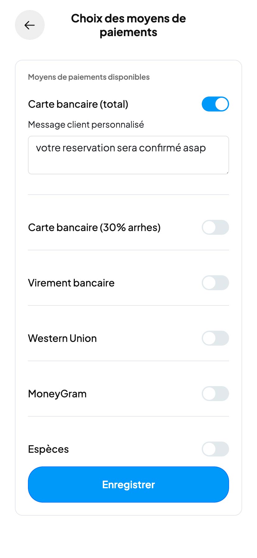 Choisissez vos modes de paiement : Carte bancaire (via Stripe), Virement, Espèces, Caution & arrhes. Le tout suivi automatiquement dans votre interface.